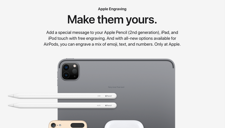 Apple Pencil을 맞춤하는 방법 중 하나는 온라인 Apple Store에서 구입시 무료 각인하는 것입니다.