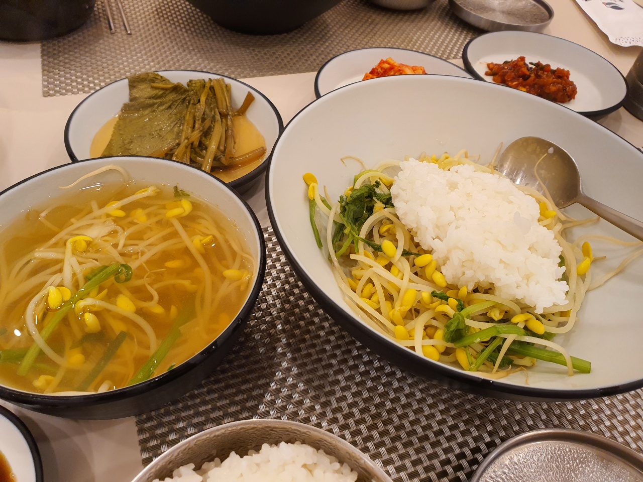 콩나물/미나리를 밥 위에 건져 내 주시고, 국도 분배해 주시니 일단 손대지 않으셔도 됩니다.
