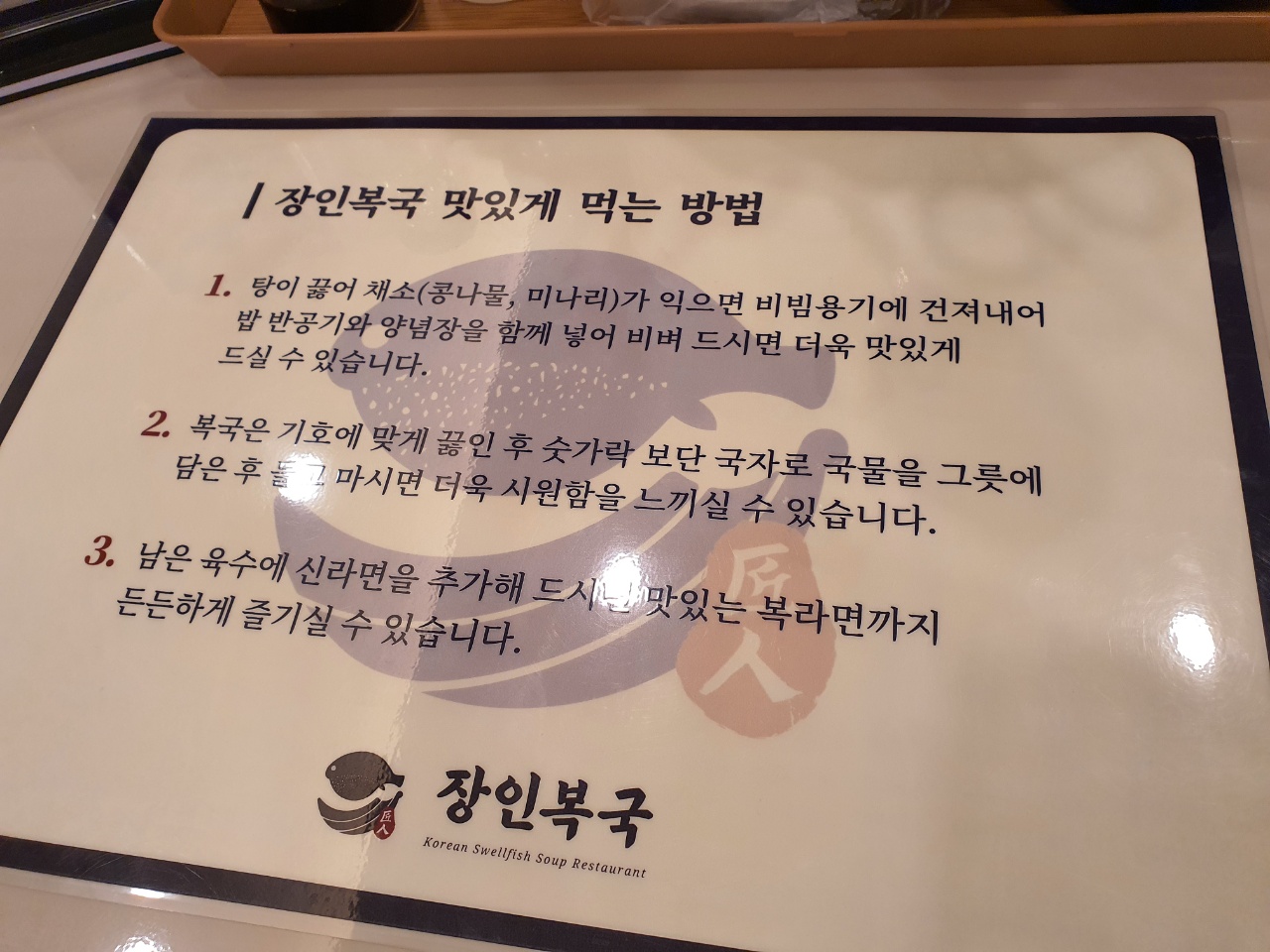 복국을 먹기 전, 메뉴판 뒤편을 살펴보면 복국을 맛있게 먹는 팁도 소개되어있습니다.