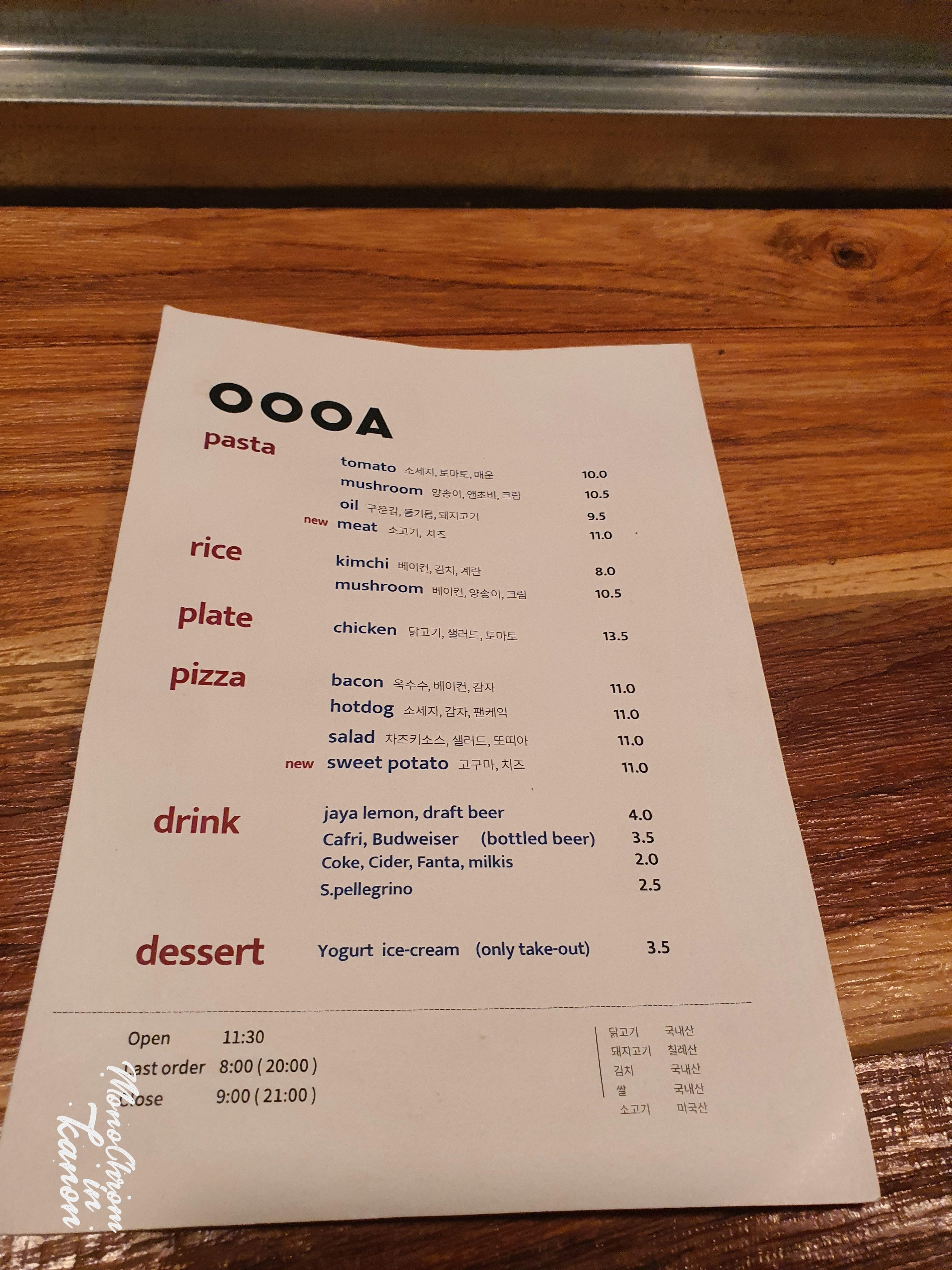 대구 반월당 옥수수 피자 맛집, oooa 메뉴판