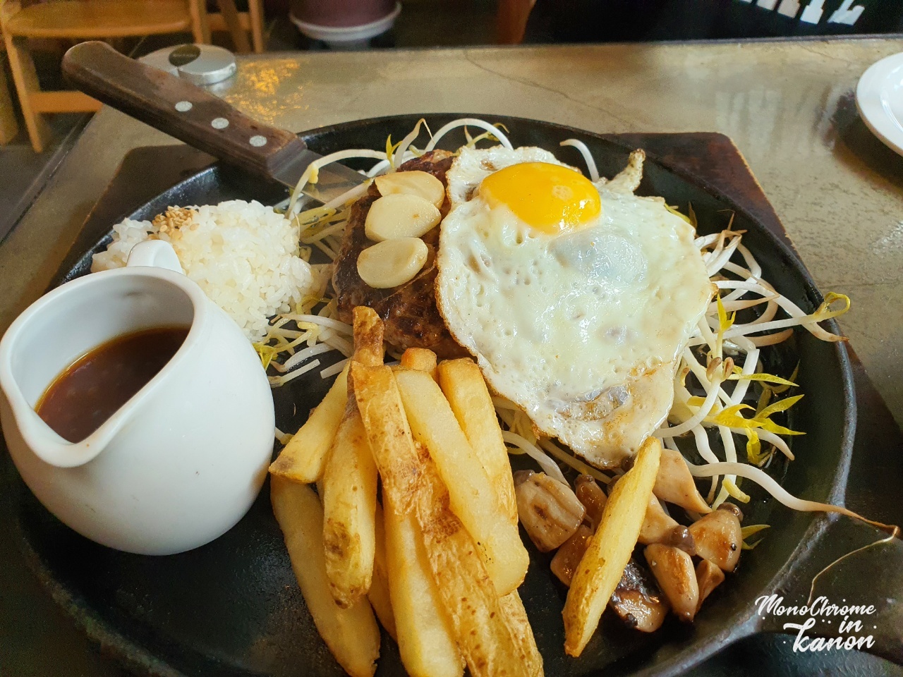 고루 숙주와 버섯, 감자튀김이 가니쉬로 올려져 있는 찹스테이크입니다.