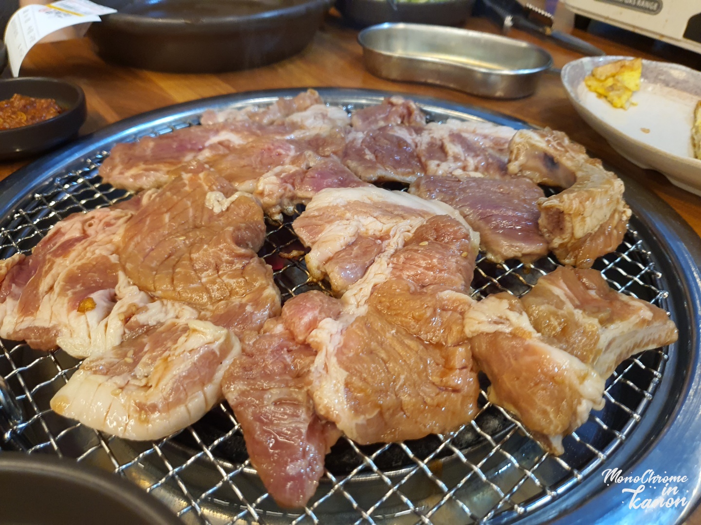 맛있게 돼지갈비가 구워지고 있는 중입니다.