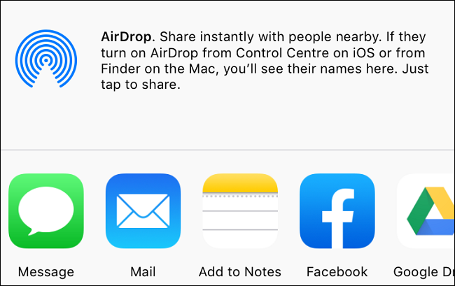 공유 메뉴의 맨 위에서 파일을 보낼 AirDrop 지원 장치를 선택합니다.