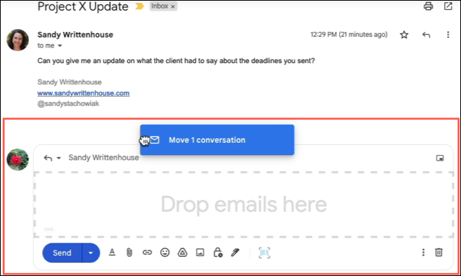 읽기 창 옵션과 마찬가지로 끌면 여기에 전자 메일 드롭이 표시됩니다.