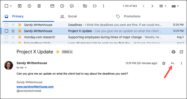 클릭한 다음 회신 아이콘(왼쪽 화살표)을 클릭합니다.