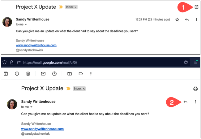 방법 1 : 이메일을 선택하고 오른쪽 상단에 있는 새 창 아이콘(화살표가 표시된 상자)을
