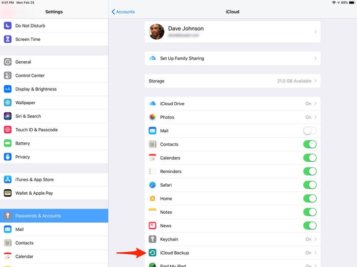 설정 앱에서 "암호 & 계정", "아이클라우드 백업"을