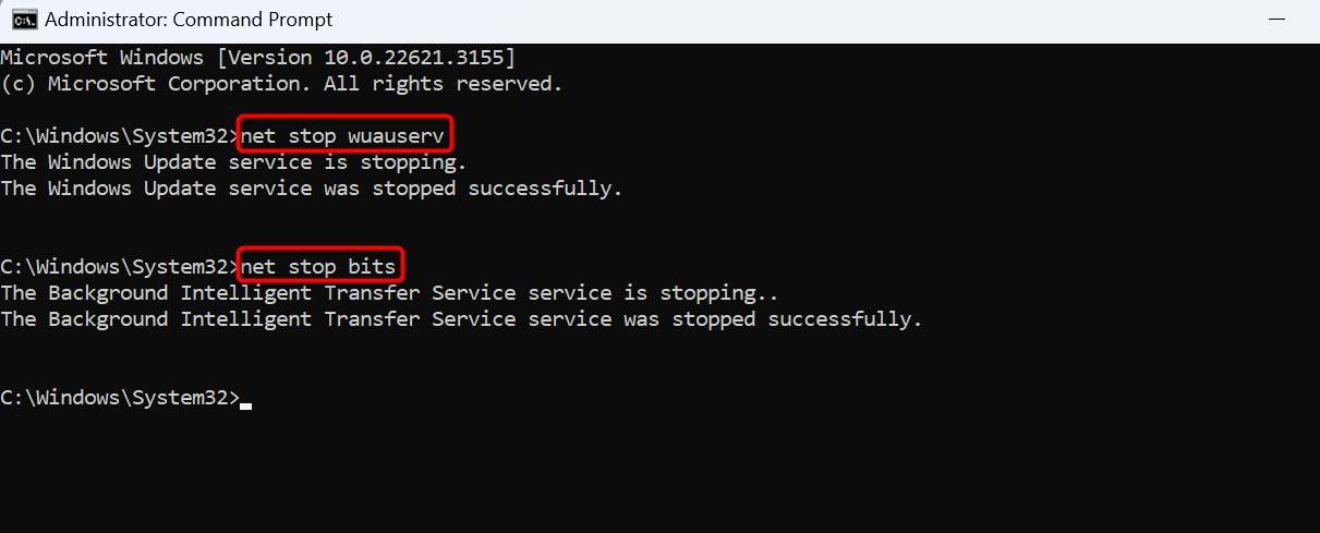 명령 프롬프트에 다음 행을 입력하고 각 행 뒤에 Enter 키를 누릅니다. 첫 번째 명령은 Windows Update 서비스를 비활성화하고 두 번째 명령은 백그라운드 지능형 전송 서비스를 끕니다.