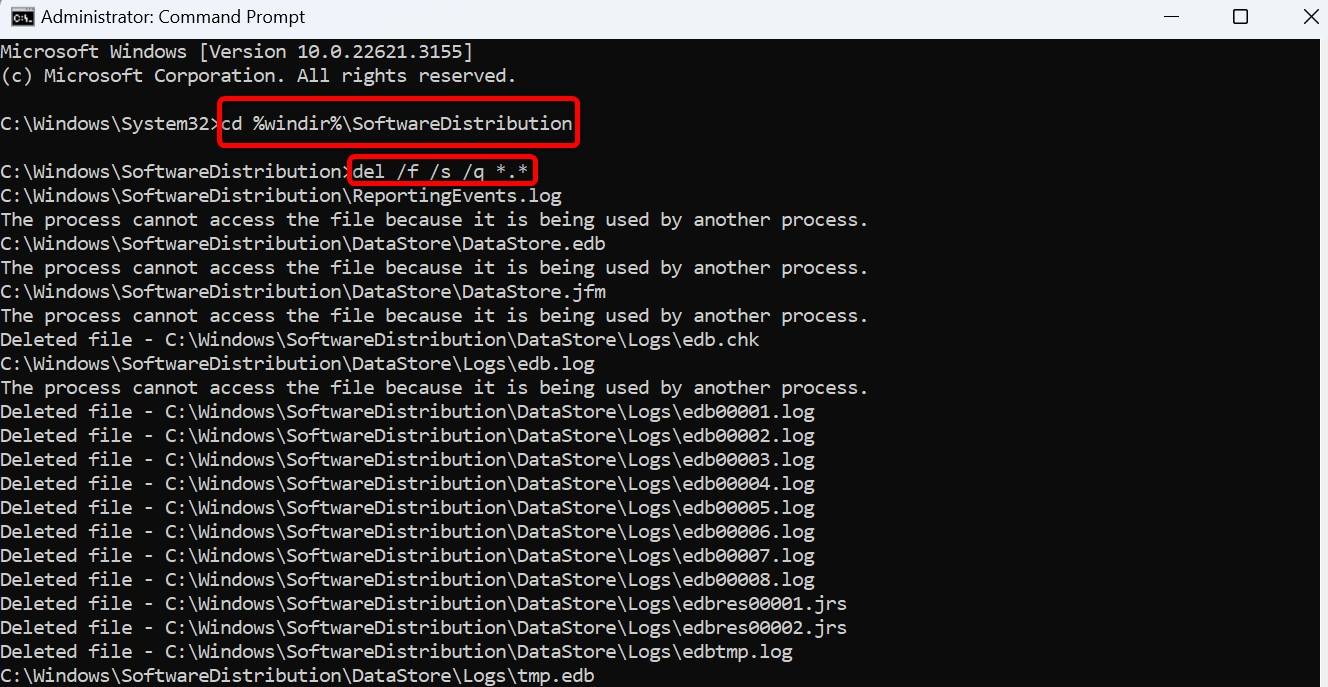 다음으로 다음 명령을 실행하여 Windows Update 캐시 폴더를 현재 작업 디렉터리로 만듭니다.
