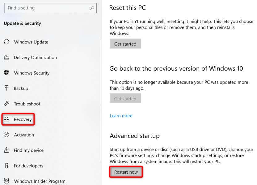 왼쪽 사이드바에서 [복구]를 선택합니다.
