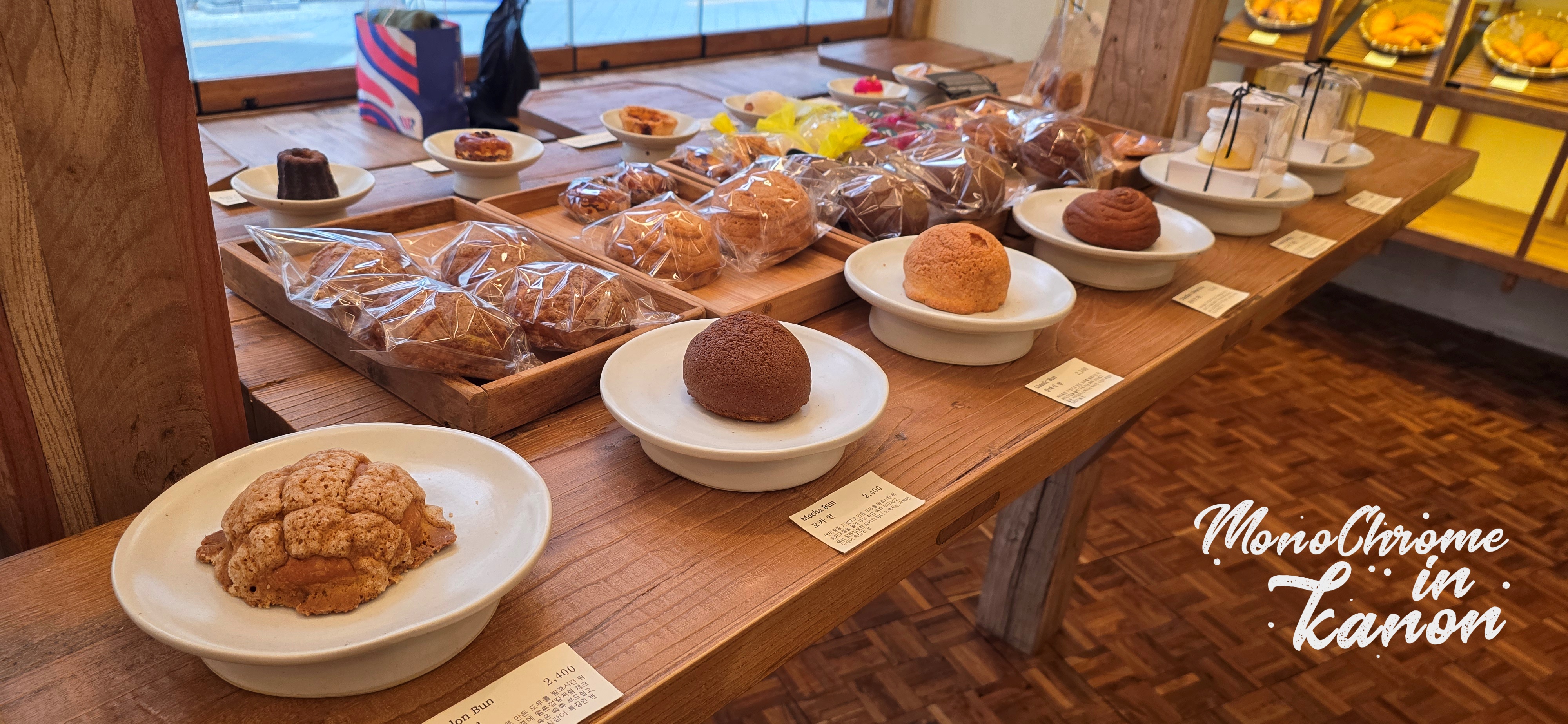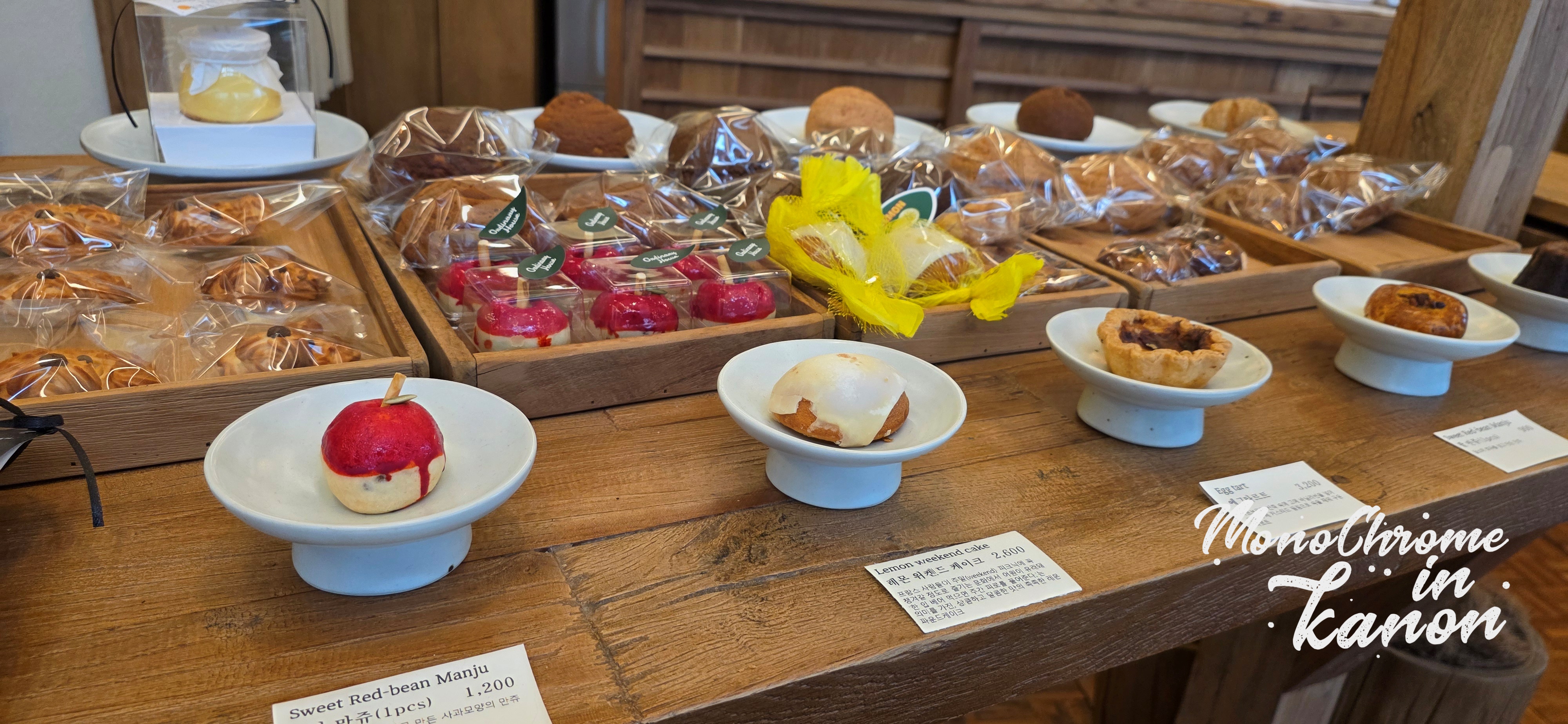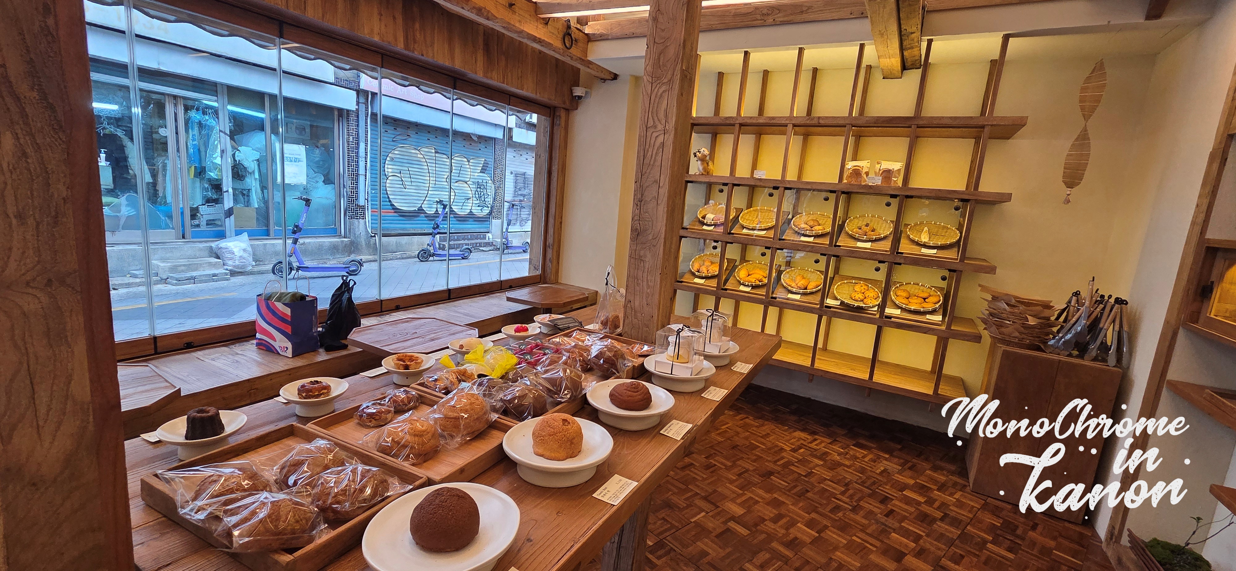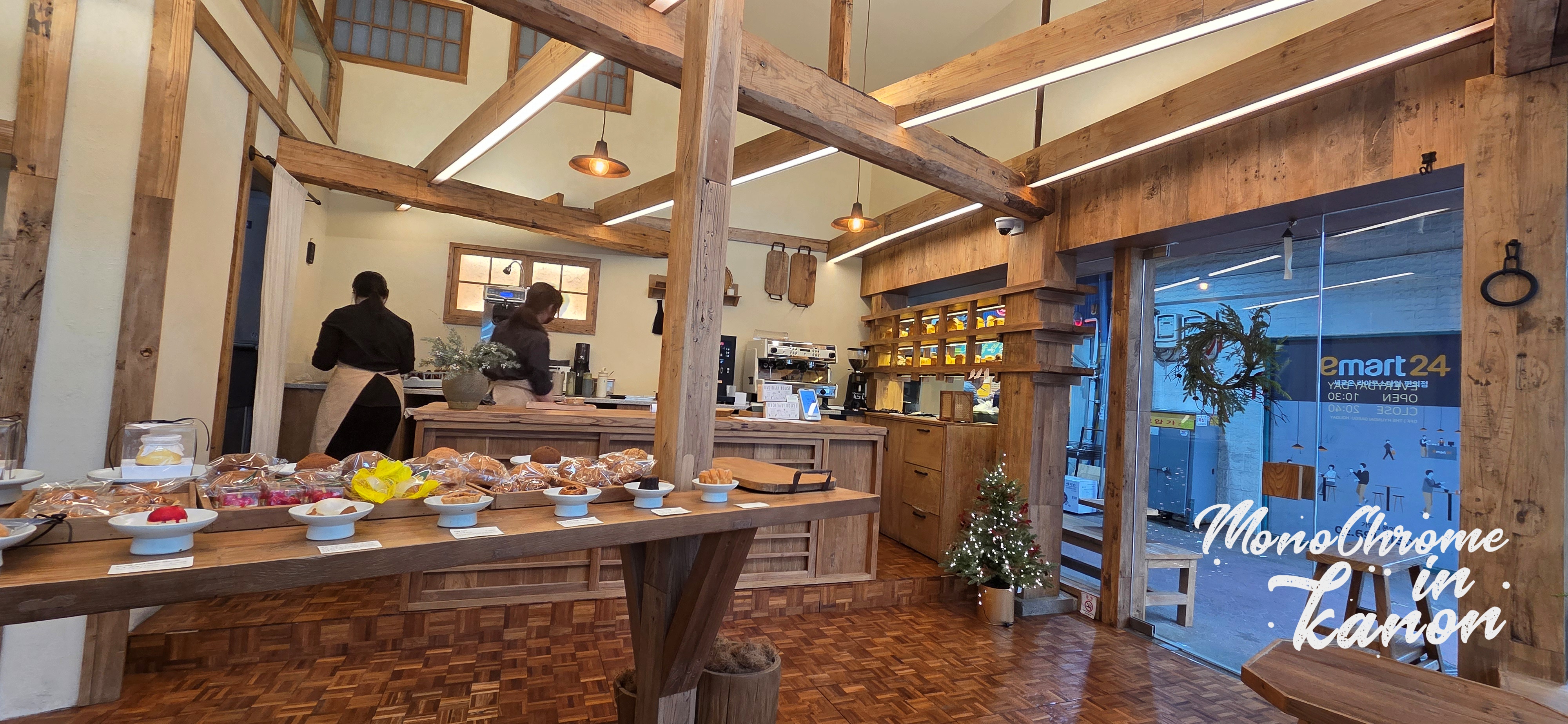 - 원목 테이블과 패브릭 매트가 어우러진 차분한 제과점 무드