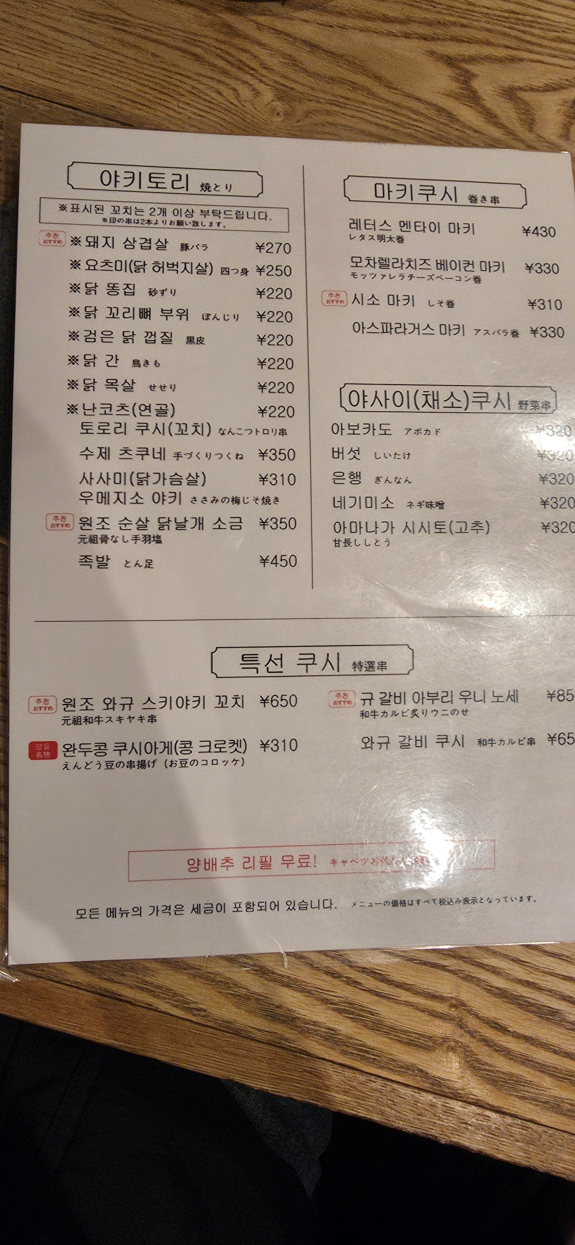 후쿠오카 하카타역 인근 야키토리 맛집, 야키토리노 하치베이 벳칸의 한국어 메뉴!